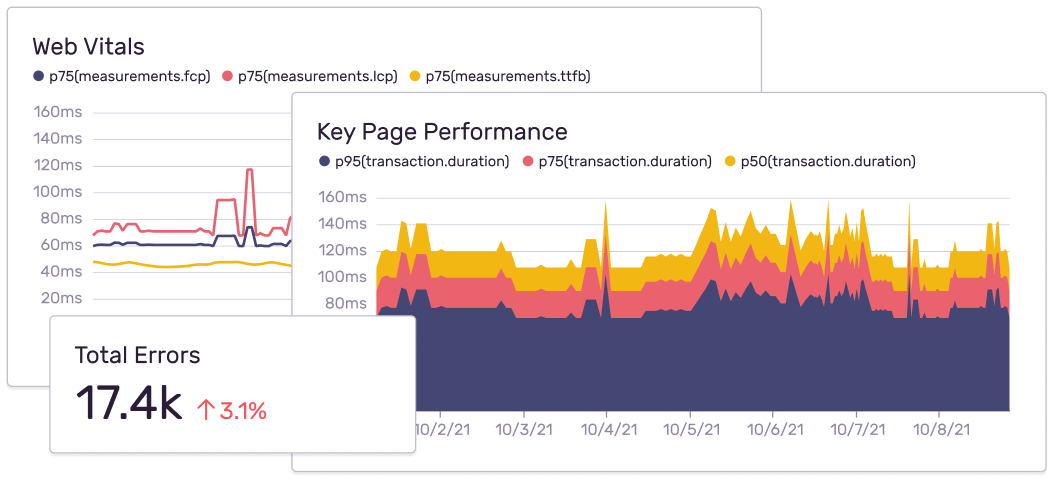 Build and share custom views to keep a pulse on the most critical parts of your business. Correlate release health with latency and alert spike to learn where to focus engineering effort. Track release frequency, version quality over time, issues by customer or region, or literally anything you can query.