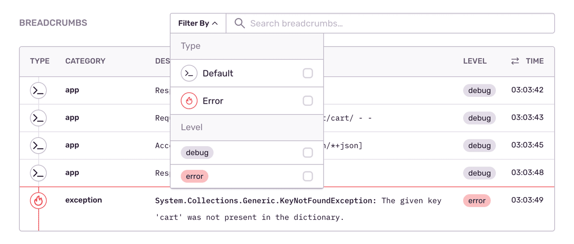 See ASP.NET stack trace details like filename and line number so you never have to guess. Filter and group ASP.NET exceptions intuitively to eliminate noise. Monitor errors at scale without impacting throughput in production.
