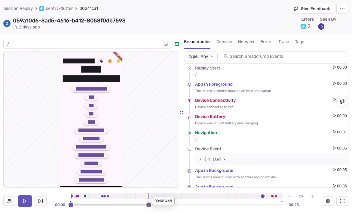Debug Flutter apps and prevent crashes across your entire stack. Flutter crash reporting and logging with a single view so you can diagnose, fix, and optimize the performance of your code with maximum efficiency.