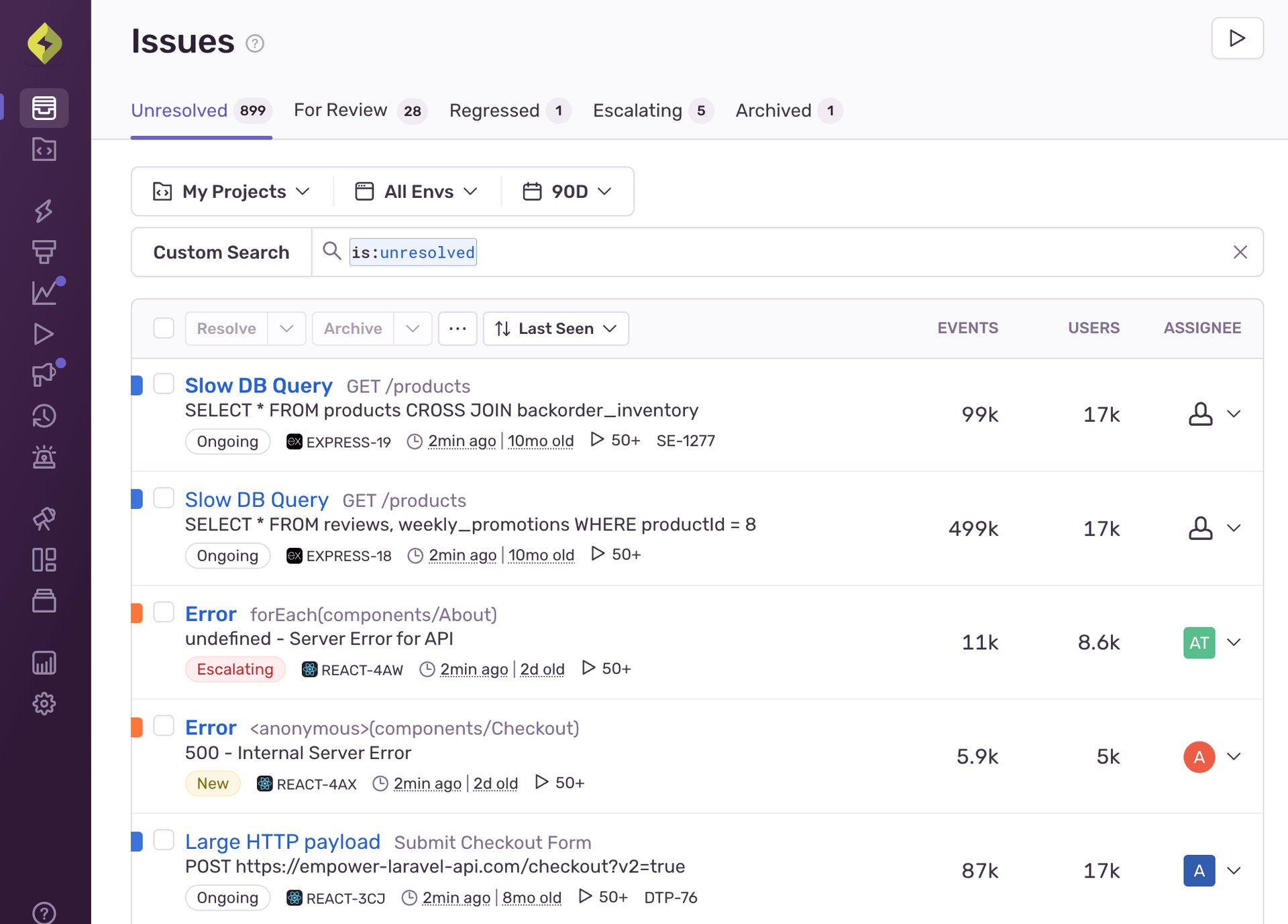 Get alerted whenever a deploy introduces an error and dive into triaging, assigning, reproducing, and fixing the problem with all the information you need to kick off your workflow with confidence.